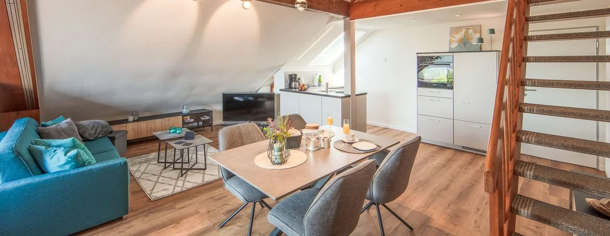 Der offene Wohn-Ess-Bereich ist das Herzstück der Wohnung. Relaxen Sie auf dem komfortablen Sofa und schauen einen guten Film oder genießen Sie am Esstisch mit den gemütlichen Stühlen gemeinsame Mahlzeiten. Die voll ausgestattete Küche lässt keine Wünsche offen. Sie ist mit einem Cerankochfeld, Backofen, Spülmaschine, Kühlschrank, Gefrierfach, Wasserkocher, Kaffeemaschine sowie Geschirr und Besteck bestens ausgestattet. Somit können Sie Ihre Lieblingsgerichte problemlos zubereiten.