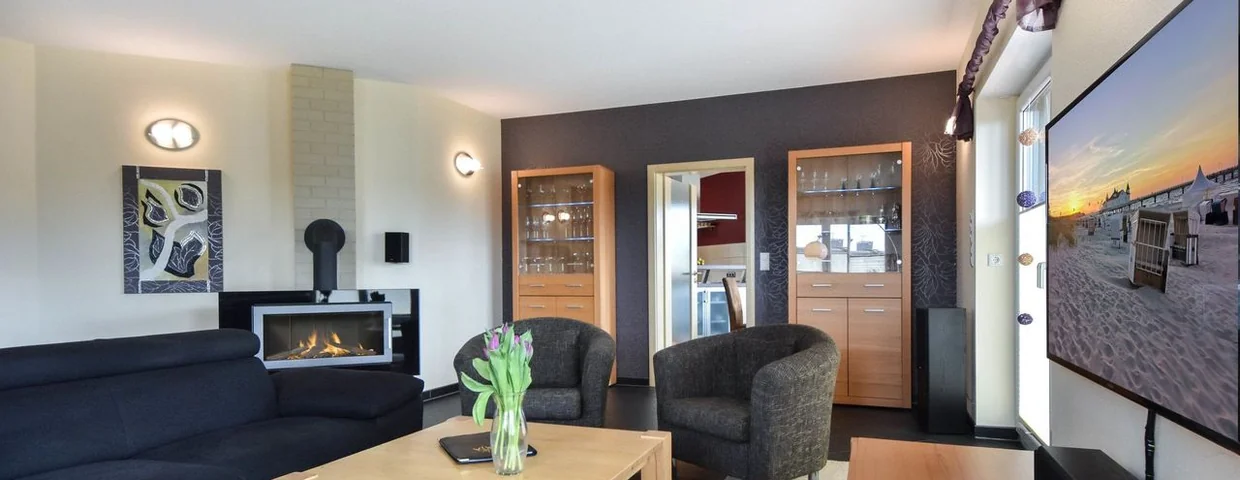 Das geräumige Wohnzimmer ist stilvoll eingerichtet mit einer weitläufigen Couchgarnitur, Sesseln, einem 55-Zoll-Flachbild-TV und einem Surround-System ausgestattet. An kalten Wintertagen sorgt der Kamin für zusätzlichen Komfort und angenehme Atmosphäre. In den Sommermonaten genießen Sie Ihre Abende im gemütlichen Beisammensein auf der anliegenden Terrasse. Während Sie den fest installierten Kamingrill einheizen, haben die Kinder Spaß im Garten mit Spielturm, Rutsche und Schaukel. Sollte das Wetter einmal nicht mitspielen, lässt es sich auch hervorragend im Küchen- und Essbereich dinieren. Am großen Esstisch findet jedes Familienmitglied Platz. Die hochwertig ausgestattete Küche lädt mit nützlichen Küchenhelfern auch zum Kochen und Selbstverpflegen ein.