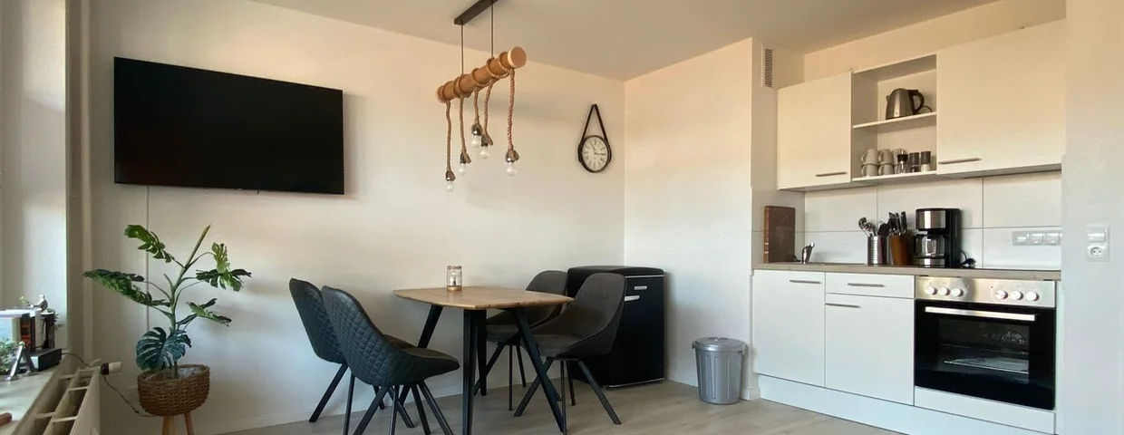 Das kernsanierte und neu eingerichtete 43 qm Ferienapartment befindet sich im 2. OG mit Balkon. Beim Betreten der Wohnung empfängt Sie ein langer Flur, mit viel Staufläche und von dem alle Räume abgehen. Im Wohnzimmer lässt sich alles vereinbaren Essen, Kochen, Relaxen, Entspannen. Die offene, moderne Pantry- Küche ist gut ausgestattet und verfügt über alle Dinge, die sie im Urlaub benötigen. Ein Esstisch lädt zum gemeinsamen Frühstück und Abendessen für 2-4 Personen ein. Das gemütliche Schlafsofa (200 X 150) im Wohnzimmer bietet Platz für eine weitere Person. Im kuscheligen Schlafzimmer (Doppelbett 160 x 200 cm) lässt sich der Abend entspannt ausklingen. Das innenliegende Badezimmer ist modern gefliest und verfügt über eine Dusche.
