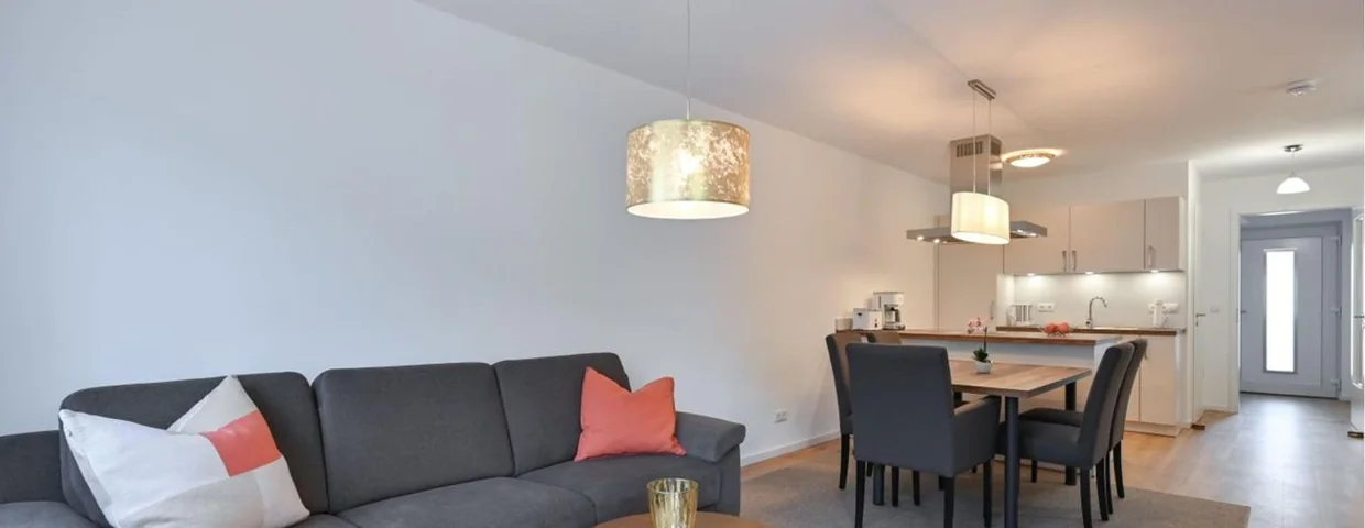Die Wohnung wurde von den Eigentümern liebevoll und hochwertig ausgestattet. Der großzügige Wohnbereich, der gemütliche Essbereich mit Platz für 4 Personen und die offene, voll ausgestattete Küche laden zum Verweilen und genießen ein. Die Küche ist komplett mit allem ausgestattet, was für den täglichen Bedarf benötigt wird. Am großen Esstisch lässt es sich bei einem gemeinsamen Frühstück sehr gemütlich in den Tag starten. Der großzügig geschnittene Wohnbereich besticht durch seine moderne Sofaecke, die zum Entspannen und relaxen einlädt. In der Wohnung befinden sich zwei Schlafzimmer. Im kleineren Schlafzimmer befinden sich zwei Einzelbetten (je 90x200cm), das große Schlafzimmer mit zusätzlichem Zugang zum Balkon bietet eine Bettgröße von 180x200 cm. Das geräumige Badezimmer verfügt über eine sehr großzügige, bodengleiche Dusche, ein Waschbecken mit Spiegel, zusätzlichem Vergrößerungsspiegel, höhenverstellbarerer Badhocker und Waschmaschine. Durch das zusätzliche Gäste-WC mit Fenster entsteht am Morgen kein Stau.