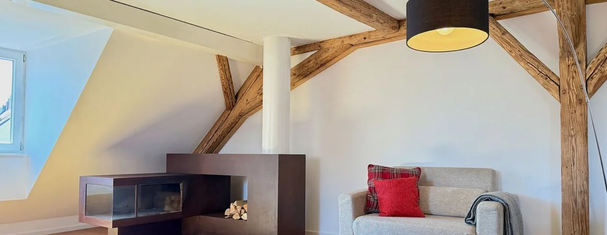 Erleben Sie eine einzigartige Kombination aus historischem Flair und modernem Luxus in dieser außergewöhnlichen Altstadt-Maisonette-Ferienwohnung. Im Dachgeschoss eines stilvollen Herrenhauses mitten in der Fußgängerzone der Lindauer Insel hat ein renommierter Vorarlberger Architekt ein unvergleichliches Wohnkonzept verwirklicht: Freigelegte Holzbalken, eine beeindruckende freistehende Treppe und ein individuell gefertigter Kamin schaffen eine warme, atmosphärische Kulisse mit besonderem Charakter.