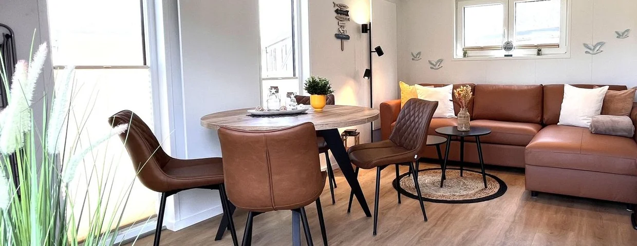 Im Inneren des Ferienhauses erwartet Sie ein offenes Wohnkonzept, das Gemütlichkeit und Funktionalität vereint. Die Ausstattung umfasst eine moderne Küche mit hochwertigen Geräten, darunter ein Herd mit Ceranfeld, ein Backofen, eine Spülmaschine sowie ein Kühlschrank mit Gefrierfach, die das Zubereiten eigener Mahlzeiten zu einem Vergnügen machen. Ein Essbereich mit Esstisch lädt ein, gemeinsame Mahlzeiten zu genießen, während das Wohnzimmer mit einem bequemen Sofa und einem Fernseher für entspannende Abende sorgt.
