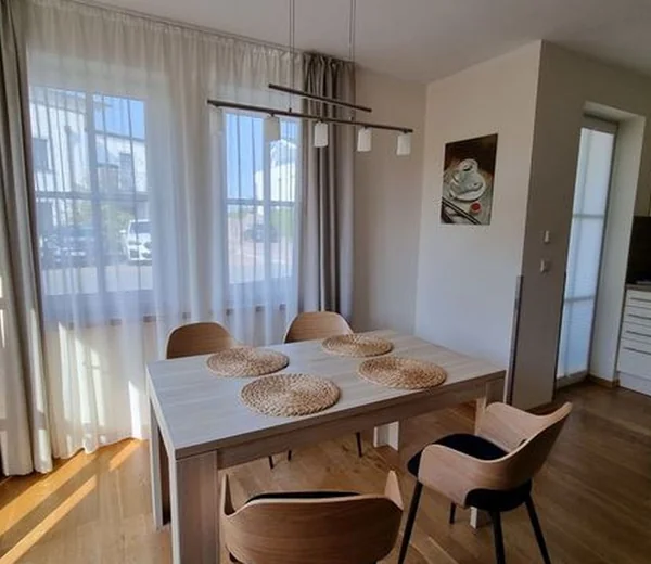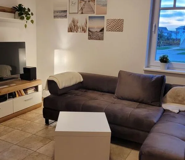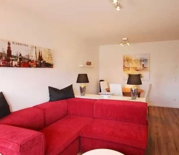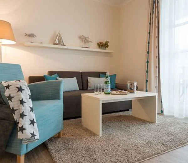 Die exklusive Ferienwohnung befindet sich in der 1. Etage des Aparthotels und bietet auf 49 m² viel Platz für bis zu 4 Personen. Der gemütliche Wohnbereich besitzt ein bequemes Sofa, welches sich mit wenigen Handgriffen zu einer Doppelschlafcouch (1,40m x 2,00m) umfunktionieren lässt, und sorgt mit einem Flatscreen-TV für reichlich Entertainment.