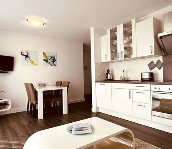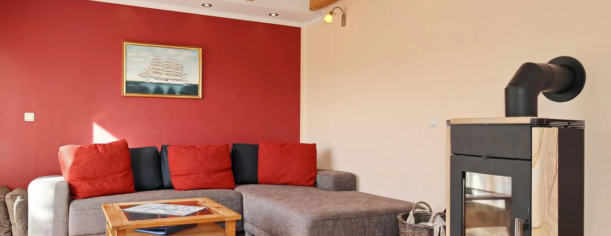 Der offene Wohn- und Essbereich der Ferienwohnung verfügt über ein Sofa, einen Flachbild-TV, einen Blu-Ray-Player sowie ein Radio mit CD-Player. Zusätzlich steht dir kostenloses WLAN (ohne Gewähr) zum Abrufen von Mails o.ä. zur Verfügung. Das WLAN ist nicht zum Streamen von Filmen geeignet. Die gemütliche Essecke lädt zum Verweilen bei gemeinsamen Mahlzeiten oder netten Spieleabenden ein. Der Kamin sorgt besonders in den kälteren Monaten für wohlige Wärme und Gemütlichkeit. Vom Wohnbereich aus hast du Zugang zur sonnenverwöhnten Terrasse.