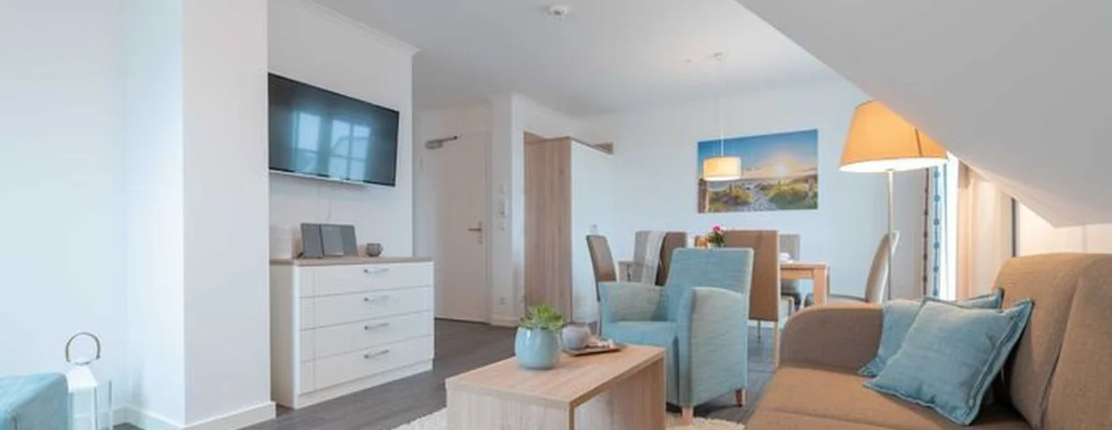Ankommen, wohlfühlen, genießen nur 300 m vom Ostseestrand entferntDie große Dachgeschosswohnung mit Meerblick und zwei Balkonen ist das perfekte Urlaubsdomizil für Gruppen mit bis zu vier Erwachsenen und zwei Kindern (bis 12 Jahre). Ob mit Freunden oder der Familie in diesem exklusiv und modern eingerichteten Drei-Zimmer-Apartment ist Entspannung und Erholung vorprogrammiert. Herzstück der Wohnung ist der offene Wohn- und Essbereich. Eine gemütliche Sitzecke mit Eckcouch (inkl. Schlaffunktion), zwei Sessel und ein Flat-TV laden zum Relaxen ein. In der hellen Wohnküche finden Sie alles, was Sie zum Kochen benötigen inklusive einem Herd mit Glaskeramik-Kochfeld und Backofen, einer Kühl-Gefrierkombi, einem Geschirrspüler, modernen Küchengeräten und hochwertigem Geschirr. Der große Esstisch mit sechs Stühlen ist der ideale Platz für ausgiebiges Schlemmen und Zusammensitzen. Bodentiefe Fenster sorgen für viel Licht und führen auf einen der beiden Balkone mit Meerblick. Dort erwarten Sie komfortable Terrassenmöbel. Frühstücken Sie mit traumhaftem Ausblick oder lassen Sie den Tag bei einem Glas Wein am Abend Revue passieren was kann es Schöneres geben? Zwei Schlafzimmer sorgen für erholsame Träume. Jedes Zimmer verfügt über einen großen Kleiderschrank für Ihr Urlaubsgepäck. Kommen Sie an und fühlen Sie sich wie zu Hause. Besonderen Komfort bietet das größere Schlafzimmer mit einem Boxspringbett mit Bandscheiben-Federkernmatratzen (1,80 x 2,00 m), einem weiteren Flat-TV sowie dem Zugang zum zweiten Meerblick-Balkon. Zusätzlich zum Hauptbad mit bodentiefer Dusche, einem großen Waschtisch, Wandspiegel und Fön steht den Gästen ein zusätzliches separates WC zur Verfügung.Zur Ferienwohnung gehören zudem ein PKW-Stellplatz und Fahrradständer.Wäscheset, Kinderreisebett und Kinderhochstuhl können kostenpflichtig zugebucht werden.Es handelt sich um eine Nichtraucherwohnung. Es sind keine Haustiere erlaubt.Sichern Sie sich zusätzlich den Anspruch auf einen der begehrten Strandkörbe nur ein paar Meter entfernt von den rauschenden Wellen der Ostsee (Anfang Mai - Ende August) und buchen Sie jetzt zu besonderen Konditionen (12,00 Euro pro Tag oder 75,00 Euro pro Woche.)Freuen Sie sich auf einen unvergesslichen Urlaub, inmitten unberührter Natur, fernab vom Städtetrubel sowie auf lange Strandspaziergänge oder Radtouren entlang der herrlichen Ostseeküste. Tanken Sie neue Energie und sammeln Sie Erinnerungen! Wir lieben Börgerende und hoffen Sie verlieben sich auch.